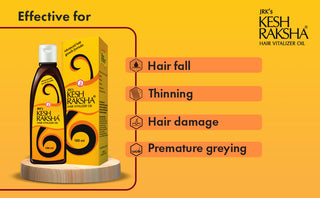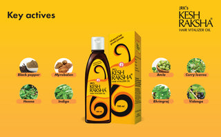 JRK's Kesh raksha hair vitalizer oil is an advanced formulation with eight select medicinal herbs such as Piper nigrum (Black pepper), Terminalia chebula (Myrobalan), Bergamia koenigii (Curry leaves), Lawsonia alba (Henna), Phyllanthus emblica (Amla), Indigofera tinctoria (Indigo),Eclipta alba (Bhringraj) and, Embelia ribes (Vidanga) that arrest hair fall and also nourish scalp & hair.It is non sticky, non-greasy and makes the hair strong and dense. This premium oil penetrates faster into the scalp and prevents hair loss.