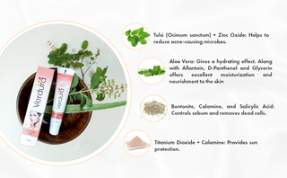Aloe vera and tulsi provide soothing and anti-microbial effects by working on various mechanisms that cause acne resulting in clear skin.